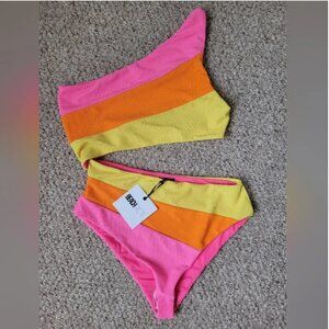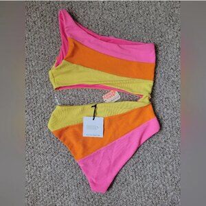 Free People NWT Beach Riot Celine One-piece Swimsuit Colorful Colorblock pink yellow one-shoulder size L