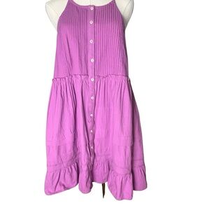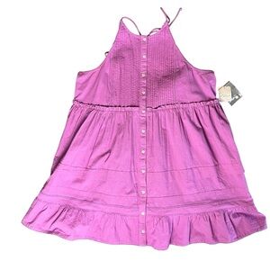 This Free People dress is a playful and breezy halter-style mini dress, perfect for warmer days. Crafted from 100% cotton, it features a soft lilac hue with delicate pintuck detailing on the bodice and a button-front closure for added charm. The tiered skirt is accented with subtle crochet lace trim, giving it a bohemian flair. The open back is secured with adjustable tie closures at the neck and waist, adding a touch of flirtiness. Lightweight and breathable, this dress is ideal for casual outings, beach trips, or summer festivals.