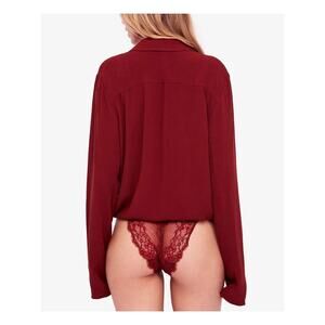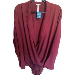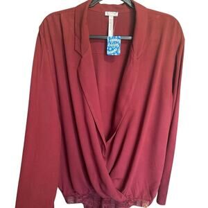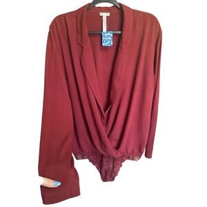 Free People NWT Elsa Bodysuit Blouse Deep V Neck Collared Burgundy Red Size Larg
