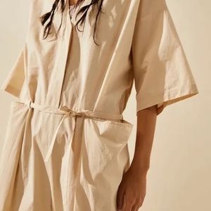 Features: Button-up silhouette, V-neckline, belted tie waistband, dropped pouch pockets