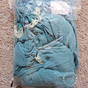 A beautiful dusty blue, like a sky at dusk. Super rare color. This beautiful dress has a slit in the front and bells on the tassels.