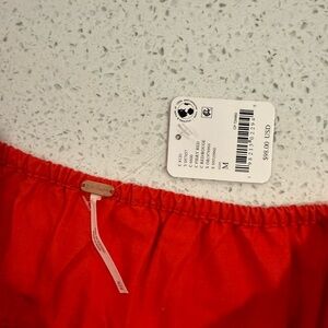 Bright red mini skirt with floral embroidery. Features scalloped hem and drawstring waist.