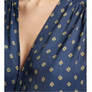 Brand new with tags Free People Starry Dreams printed blouse in dark blue. Size XS. Tie front. Hook closures at front. V-neck. Cap sleeves. Curved hem. Retailed for $68. NWT- there is writing on interior care tag.
