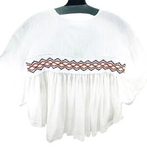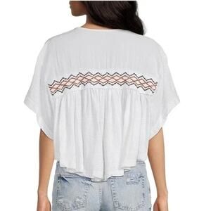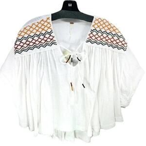 Free People NWT Women's Market Embroidery Trim Tassel Tie V-Neck Tee White Small