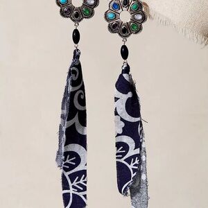 Add a versatile, vintage-inspired touch to every style with these stunning earrings featured in a dangly design with stone-adorned floral top detail and trailing printed fabric at bottom for a super cool finish.