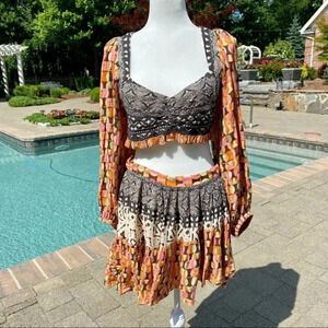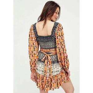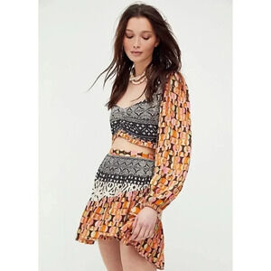 Free People Naomi Set Women’s XS Neutral Print Puff Sleeve Top Ruffle Mini Skirt
