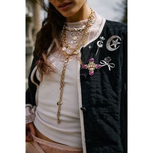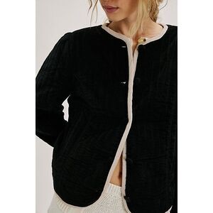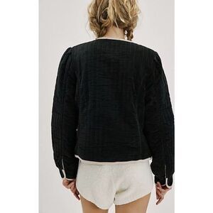 Features: Quilted velvet fabrication, collarless, puffy long sleeves, button-front closure, button cuffs