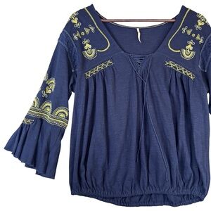 Free People Navy Blue Boho Yellow Embroidered Blouse