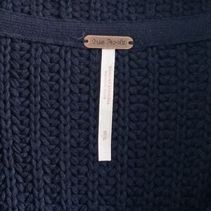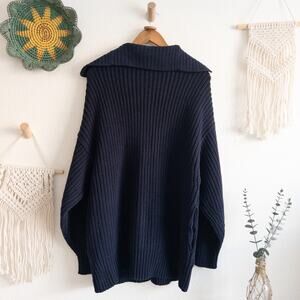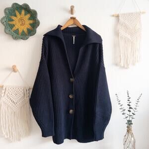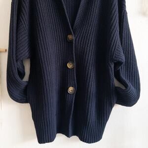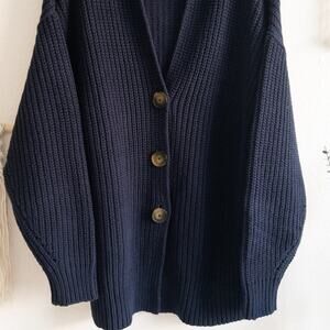 Cozy navy blue cardigan. Features large buttons. Perfect for layering.