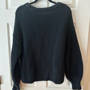 Chic navy sweater with intricate cable knit design. Cozy and versatile for any wardrobe.