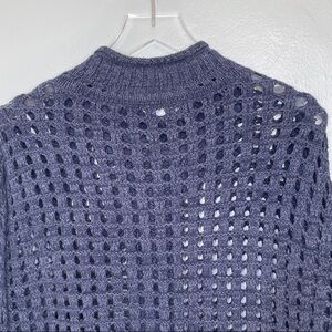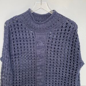 Free People crochet and knitted oversized sweater in navy. Lovely cable runs down the center of the sweater, and the cuffs and hem are knitted as well. The rest of the sweater is crochet. Probably best worn over a cami or tee shirt for coverage. Sweater has mock turtleneck for warmth and style. Really beautiful color and style. Excellent