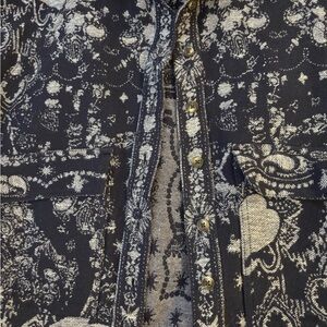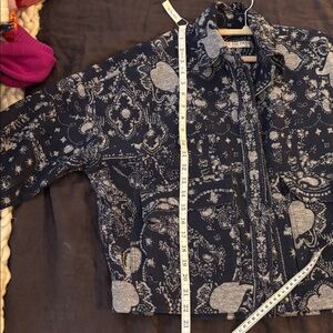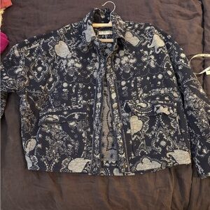 Stylish navy jean jacket with intricate white patterns. Perfect for casual outings.
