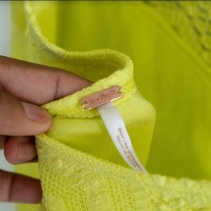 Neon yellow lace dress from Free People! A really fun and bright piece for going out. Has a really flattering low back (shown in pictures) and sheer lace midriff. Size XS but could also fit a small for a more form fitting look!