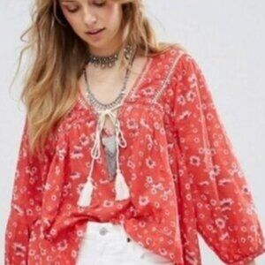 Free People | Never A Dull Moment Blouse Coral Red Peasant Floral Top | Size XS