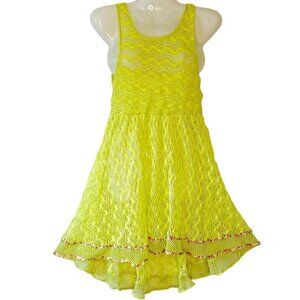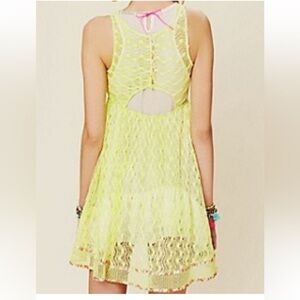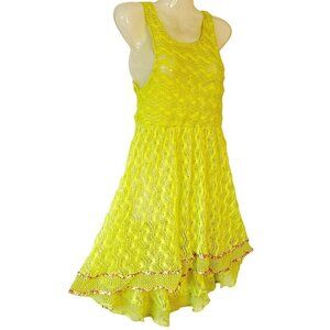 Free People New Romantics Madame Butterfly Sleeveless Scoop Neck Dress Tunic Stretch with Textured Open Crocheted Knit with Flared Skirt with High-Low Hem Bright Yellow with Pink and Green Floral Print Ribbons along Hem and Down Back at Button Closure with Cutout Below Baby Doll Style with Empire Waist Fairy Fairyfolk Flirty Lightweight Comfortable Stretchy Beach Coverup Sexy Fun BOHO Bohemian Flowy Feminine Fun Beach Travel Vacation Pool Poolside Boating
