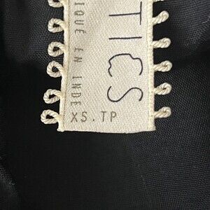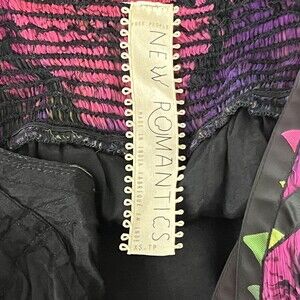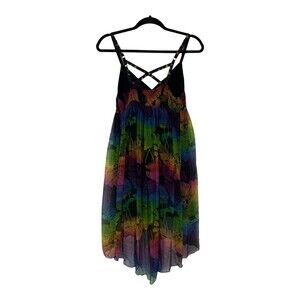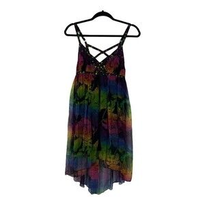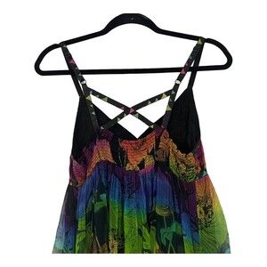 Feature vibrant and colorful bohemian style high-lo hemline dressSheer floral overlay on a black backgrondBlack slip liningBlack satin trim with multicolored geometric patternAdjustable shoulder straps, smocking elastic bobbin at backBust: 30" Unstretched