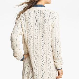 For the best of both worlds, a long and baggy boyfriend cardigan flaunts decidedly femme details, embellishing a dainty cabled pattern with metallic threads thoughout.( Gold through out )