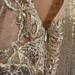 Good gently used condition, smoke and pet free home. Looks brand new, I dont see any flaws or signs of wear. Its so pretty. Size 12. No longer sold. Lined with a nude colored liner underneath. Not much stretch.