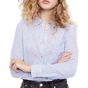 Free People No Limits Stripes Button Down Shirt In Blue. It’s a very oversized size S, so it best fits a size M in my opinion (please check measurements). The size listed is just a suggestion. It’s in excellent condition. No flaws.