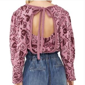 Free People No Ordinary Floral Jacquard Knit Puff Sleeves Top Pink Open Back