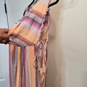 Free People, Modern, Straight, Cotton Blend Shell, 100% Rayon Lining,  Comfortable, Button Front,  Breathable, Ethical, Fall, Summer, Spring, Free People Jumpsuit Women's Medium Multicolor Striped Button V-Neck Sleeveless. Boho, bohemian, beachy, vacation