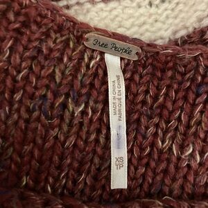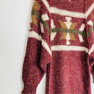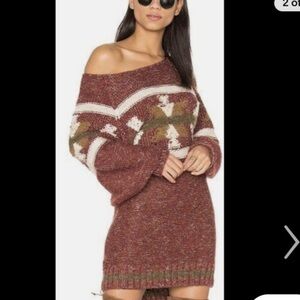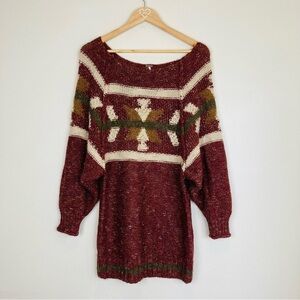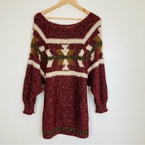 Free People “Northern Lights” mini sweater dress. Made of a blend including wool and cotton. Burgundy, cream , tan and olive colored print. Size XS