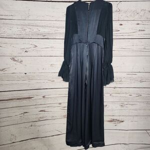The color varies from gray to blue depending on the lighting but I think the first picture is closest to the actual color. Beautiful jumpsuit with sheer sleeves, pleats, gathered sleeves at the wrists with three buttons (last pic), and two side pockets.
