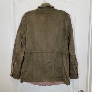 Olive green and silver (buttons) Not Your Brother's Jacket by Free People. Features a zipper closure reinforced by buttons closure, multiple cargo style snap-button pockets, wavy-cut trim, shoulder button-straps, and a purposeful fade-out fabric look. Very good pre-owned condition. Bust across the front area measures approx. 20.5 inches.