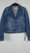 Features a front button closure, notched lapels, one-button cuffs, front welt pockets, cropped cut, slouchy, relaxed fit, denim fabrication, machine wash, tumble dry.