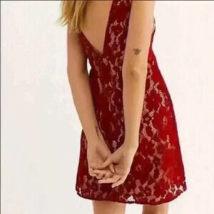 New without tags. Free People Nude shell with red lace and spaghetti straps. Sleek and sexy party dress.