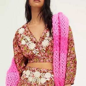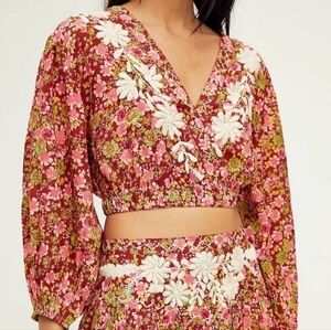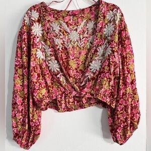 Forever femme in a floral pattern, this essential top features a long sleeve, cropped top. Free People Nyomi Embroidered Top XL Faux Wrap Elastic Waist Cinch Cuff Red Pink