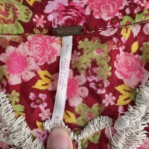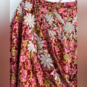 Free People Nyomi Embroidered Top XL Faux Wrap Elastic Waist Cinch Cuff Red Pink