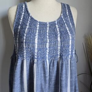Smocked Bodice. Longline, Relaxed Fit. Chambray Blue w/ White Stripes. Woven Cotton Fabrication.