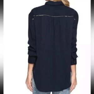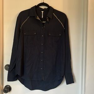 Free People Off Campus Button Down Shirt Navy Blue Gold Metallic Banding Small