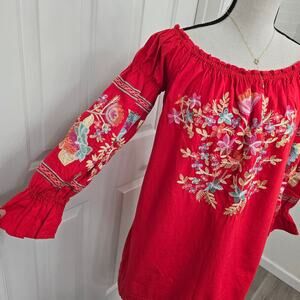 Free People Off Shoulder Embroidered Boho Dress S Red Floral Festival Gypsy Chic