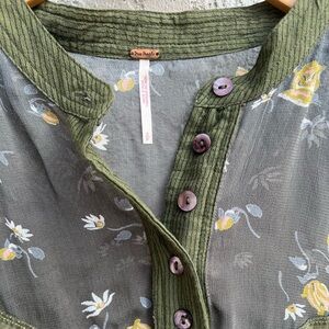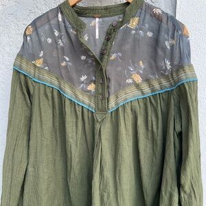 Chic olive green blouse with floral accents. Sheer yoke with button details. Perfect for casual wear.