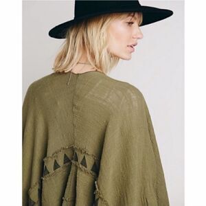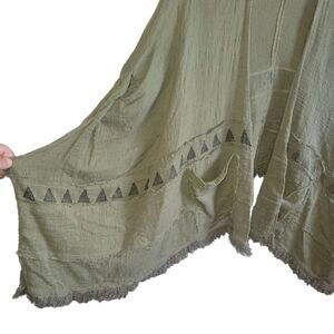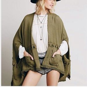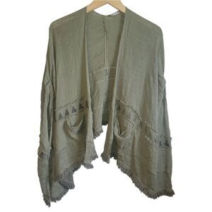 Free People Olive Green Fringe Linen Blend Oversized Open Wrap Kimono Shrug OS