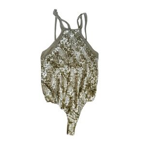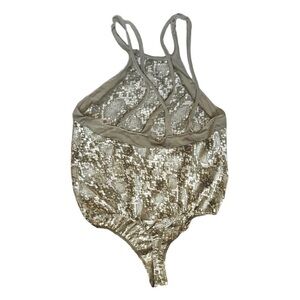 Free People Olive Green Snake Print Mesh Detail Thong Bodysuit - Size XS, NWOT