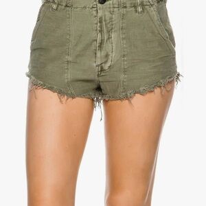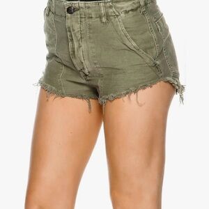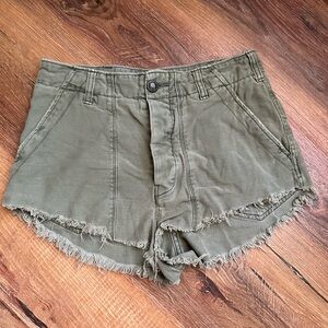 Stylish olive jean shorts. Frayed hem for a casual look. Perfect for warm days.