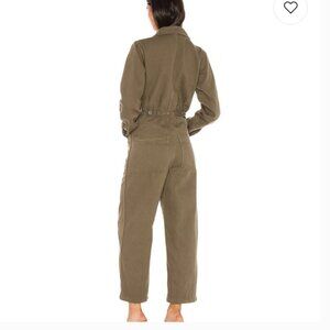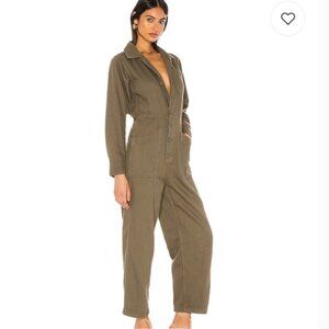 Stylish olive jumpsuit. Button-up front. Long sleeves. Multiple pockets.