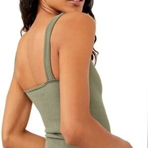 Stylish olive bodysuit by Free People. Features ribbed texture. Perfect for layering.