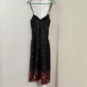 Features: Soft satin fabrication, printed detail, V-neckline with ruffled trim, dropped waist detail, smocking at sides of bust, low back, thin adjustable shoulder straps