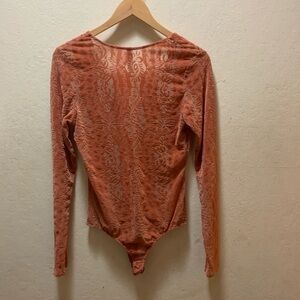 Long sleeve sheer bodysuit featuring a V-neckline and pretty velvet pattern allover. Snap button closures at the gusset for an easy on-off. Super romantic and very boho chic! It is a pretty rust/peach color.