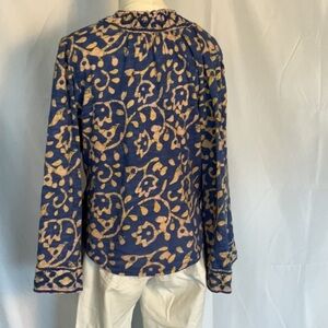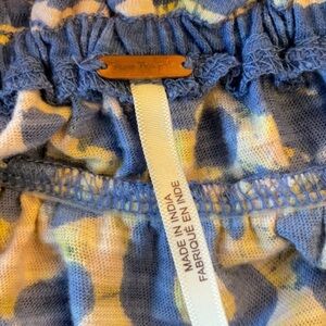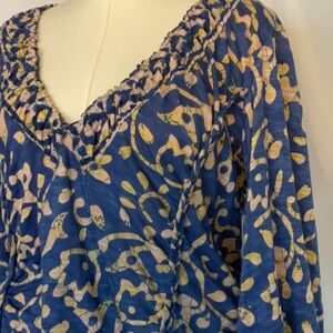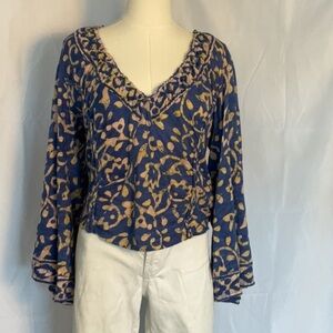 Free People On the Block Bell top in blue. Flowy bell sleeves. Ruching around v-neck. gathered from check down front torso. Front hem shorter than back. 100% cotton.