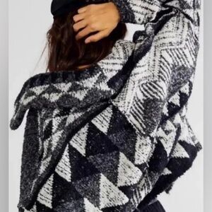 Bundle up in this so cozy cardi, featured in an oversized slouchy silhouette with exaggerated collar detail and statement geometric print throughout for added dimension.
