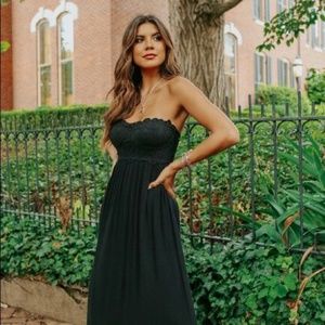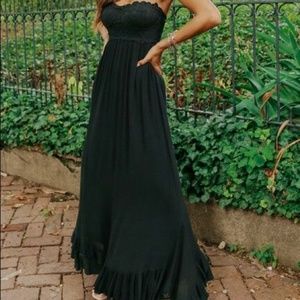 Perfect in a corset-inspired silhouette, this perfect maxi features lace piecing at the top and billowy, tiered skirt for added dimension