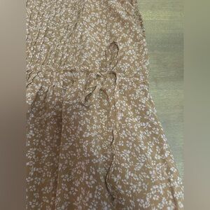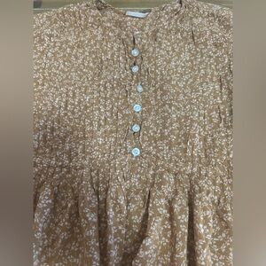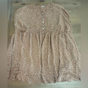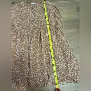 Oversized floral dress with button detailing in the front. There are drawstrings to cinch the waist and pockets on the side