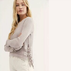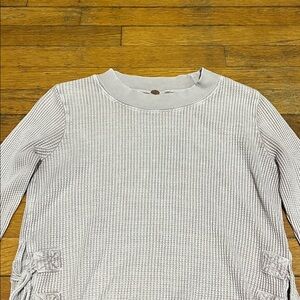 This the women’s Free People One Interlaken Thermal Long Sleeve Top. It is a thicker, waffle fabric blend long sleeve top with a unique Boho themed side tie. It is said to be cropped length, but appears to be more waist length. Has oversized long sleeves, crewneck and in a cream like color throughout.