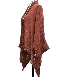 Free People One Open-Front Amaira Kimono, Cardigan, Shrug in beautiful washed mauve color. The perfect flowing layer beautiful with an open front and elegant eyelet floral trim. Charming, ultra-feminine, flirty, flowy boho chic style with an Oversized drapy look. 67% Cotton 33% Viscose