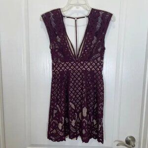 Free People One Million Lovers Lace Mini Dress Wine Purple V Neck Boho Party- This is a size 0 but the size has been blacked out- I showed the close up photo so you can see the zero